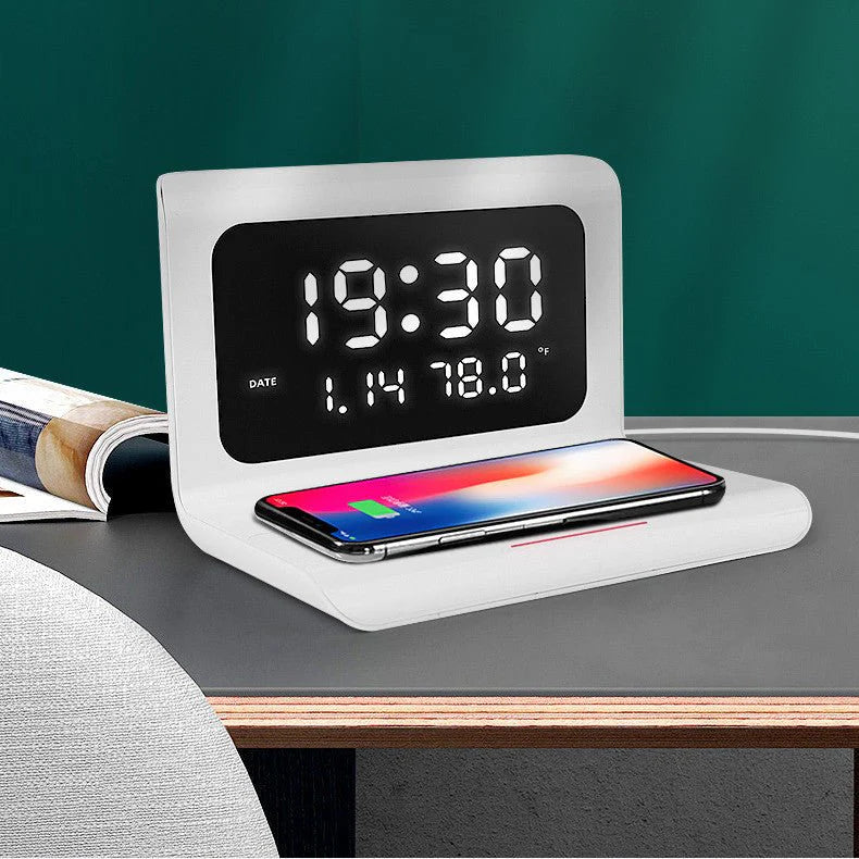 Wake up to convenience with this multifunctional wireless charging station. Featuring 10W fast charging capability, it powers your device while serving as your bedside command center. The integrated alarm clock keeps you on schedule, while the perpetual calendar and real-time temperature and humidity display provide essential information at a glance. Sleek, space-saving design eliminates bedside clutter by consolidating multiple devices into one intelligent hub. Perfect for modern homes where functionality meets style.